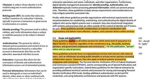 Today we released our second annotated versions of NIST’s Digital Identity Guidelines series. As the excerpt below shows, our revamped “cheat sheets” for SPs 800-63-4, 800-63A-4, and 800-63B-4 add the NIST definition of each term the first time it’s used. Our beta tester (thank you, Bill!) found this invaluable for absorbing the content faster and more accurately. The cheat sheets also highlight the recommendations and other info that, in our opinion, are most important for readers.