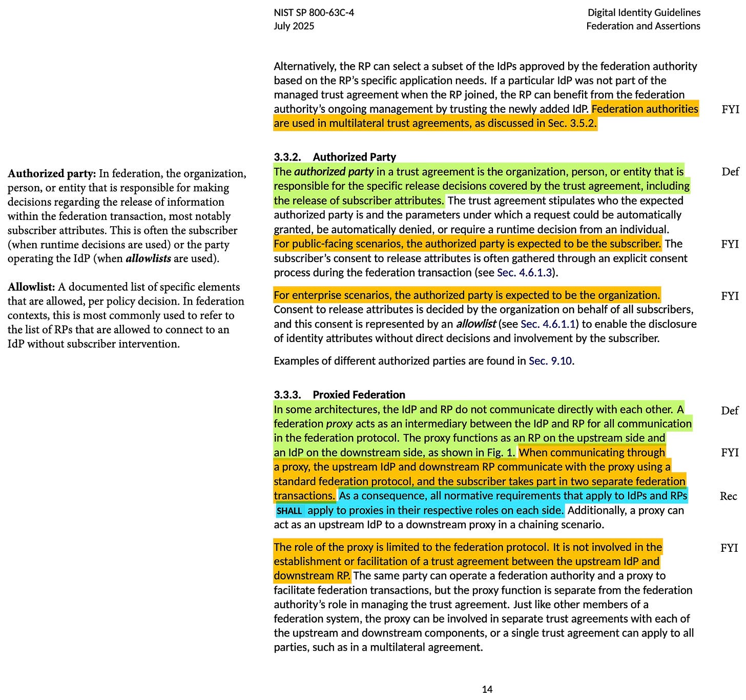 Today we released our annotated version of NIST SP 800-63C-4, Federation and Assertions. This completes our full set of human-created annotated versions of NIST’s Digital Identity Guidelines series. As the excerpt below from 800-63C-4 shows, our “cheat sheets” add the NIST definition of each term the first time it’s used. The cheat sheets also highlight the recommendations and other info that, in our opinion, are most important for readers.