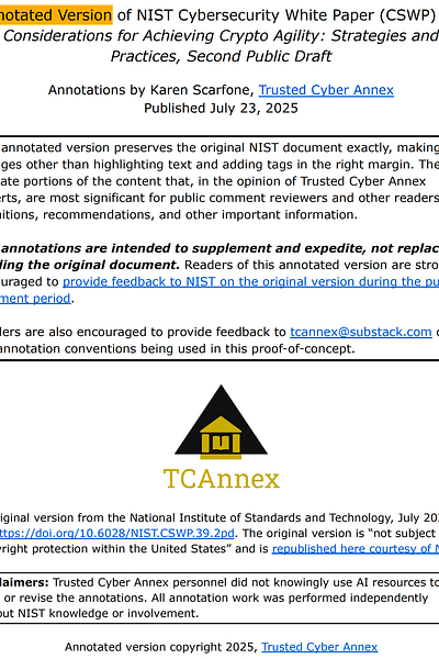 Today we’re releasing our first annotation proof-of-concept! It’s tackling NIST CSWP 39 on crypto agility strategies and practices. Having crypto agility enables an organization to quickly replace cryptographic algorithms it uses while minimizing the impact on the organization’s operations and security posture. Download the annotated version below.